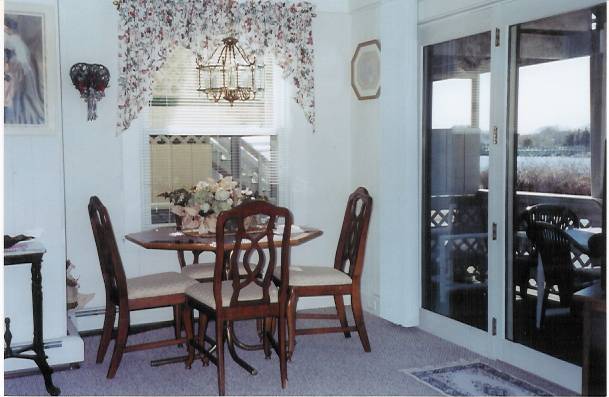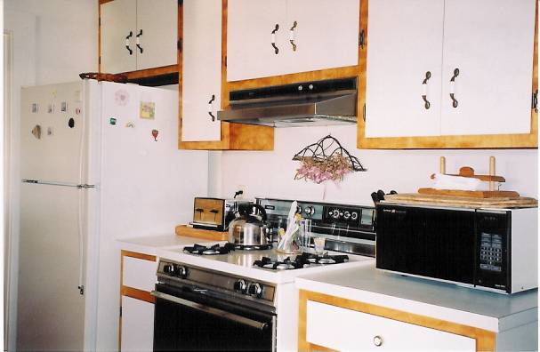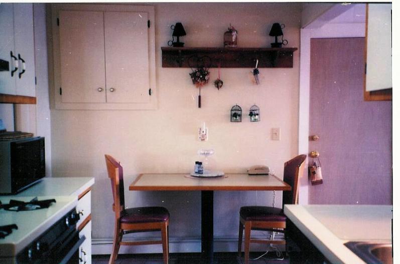 the kitchen showing the stove, fridge, microwave, table and chairs. Other